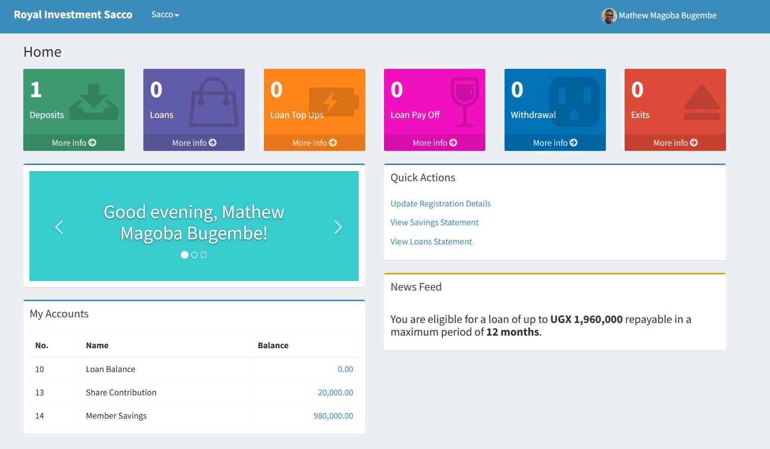 Once the Sacco Member has been authenticated and authorized, they will be redirected to the member home page.