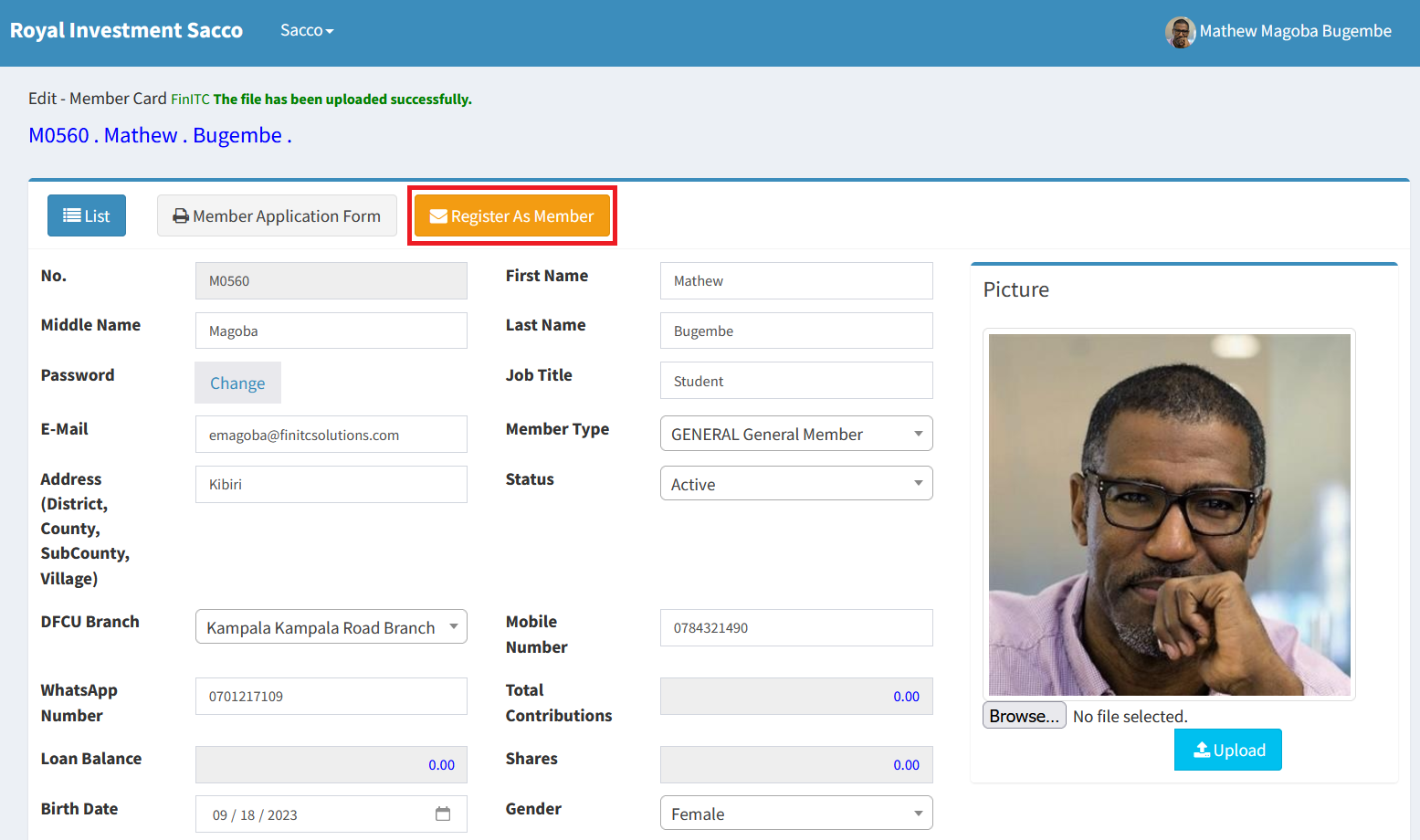 After updating your profile by following the steps highlighted above, attach a scanned standing order showing how your monthly deduction should be made. Click the Register as member button to register as a member. This will send an e-mail notification to the SACCO administrator.