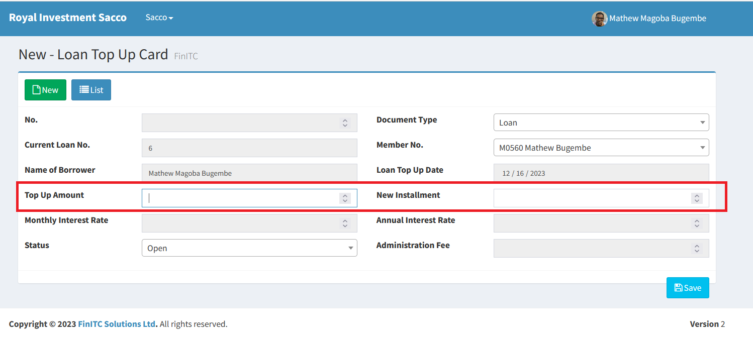When a member requests for a loan top-up, a new loan is created by getting the top-up amount, adding the outstanding loan, the interest of that month the loan top-up is request, and the outstanding loan fee. The process of applying for a loan top-up is identical to that of a loan, except, the member clicks on the tile for the loan top-ups. The loan limits discussed earlier in this documentation also apply for the loan top-ups. A member also has an option of specifying the new installment periods while applying for a loan top-up. The loan top-up also goes through an approval process and once it has been fully approved. The new loan amortization schedule is created.